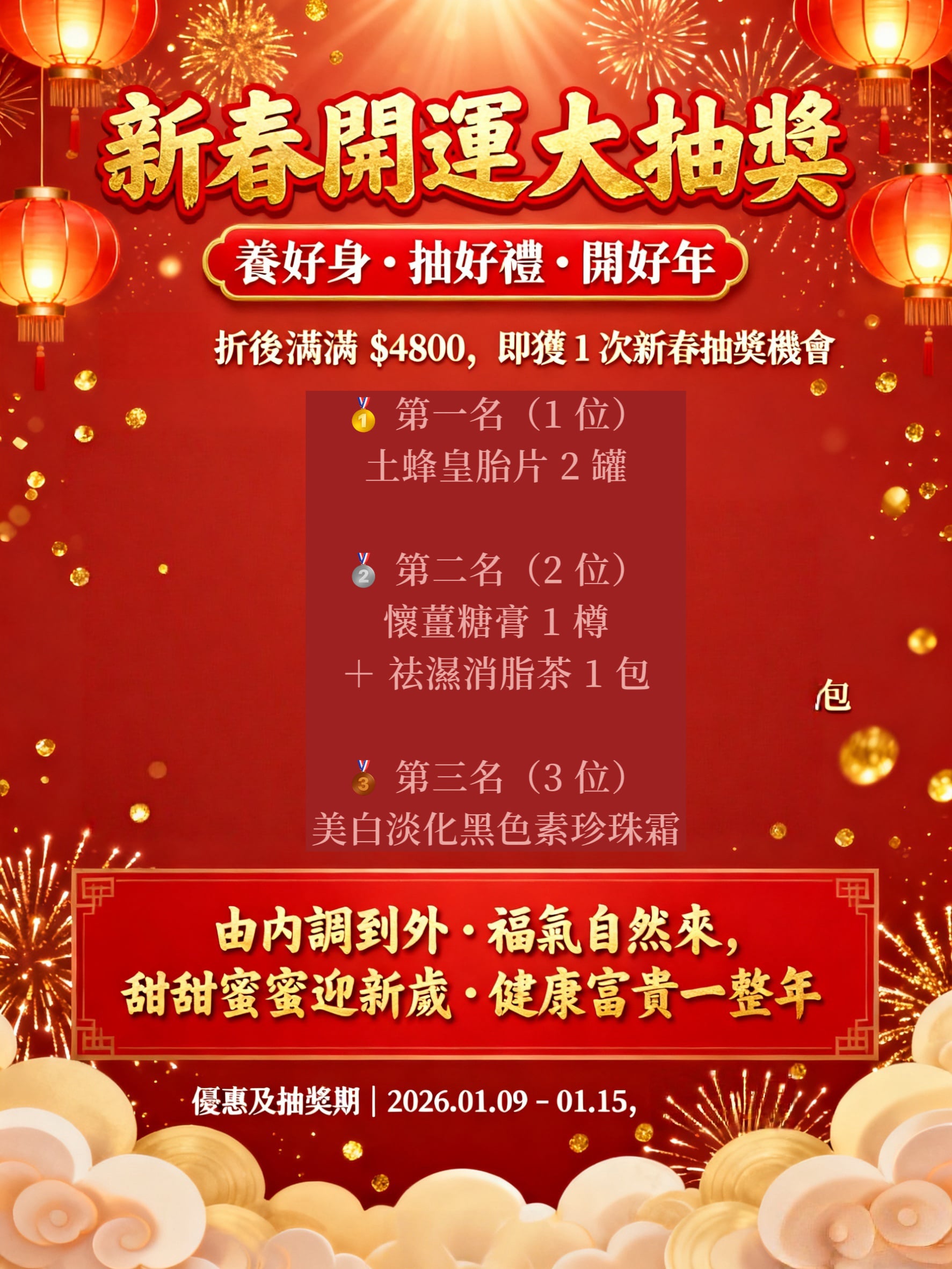 🍯【秦嶺土蜂蜜】新年滋補之選 ✨ 新年限定優惠|4送1|$1500 / 5罐 ✨ 來自秦嶺深山,一年只採一次的珍稀中華野蜂土蜂蜜 採百花藥材蜜源,真正「蜜中之王」💎 🌼 新年飲蜂蜜,寓意甜甜蜜蜜一整年 🌼 ✅ 補氣養身・護肝潤腸 ✅ 改善睡眠・增強免疫力 ✅ 美容養顏・潤膚抗老 ✅ 小朋友(1歲以上)至長輩都適合 📌 新年食法建議 ☀️ 早上空肚一匙+溫水 🌙 睡前一匙,寧神好眠 🍽 飯後食,幫助消化、去滯氣 ⸻ 💧【祛濕消脂茶】新年清體開運茶 ✨ 新年優惠|6送1|$1700 / 7包 ✨ 過年食得多、夜瞓、濕氣重? 一包茶,幫你由內「掃走舊年積落嘅濕氣」🍃 ☕ 烘焙麥香|入口甘醇不苦 ♻️ 一包可回沖2次,實惠又方便 🎯 新年飲用3大階段效果 ✔️ 1個月:去口氣、肚脹、便便順 ✔️ 1–3個月:少水腫、皮膚穩定、好入睡 ✔️ 3個月以上:脾胃強、精神好、體態輕 👨👩👧👦 2歲以上全家適用 特別適合: ▫️ 濕氣重 / 水腫 ▫️ 熬夜 / 應酬多 ▫️ 小朋友食慾差、便秘、熱氣 ⸻ 💚【參仙草精華】新年亮膚淡斑皇牌 🌸 被封為「淡斑界娘娘」的秘密 🌸 新一年,塊面唔好再黃住過年! 跟足28日肌膚代謝周期, 由根源狙擊:斑・暗沉・老化 ✨ 🌿 四大宮廷級草本精華 ✔️ 人參|抑制黑色素 ✔️ 靈芝|抗氧淡斑 ✔️ 白芨|嫩滑透亮 ✔️ 當歸|紅潤好氣色 🔥 新年限定套裝 ✅ 買3支精華 $1688 🎁 送【土蜂皂】一塊 📌 使用秘訣: 活肌水 → 2–3滴精華 → 面霜 ⚠️ 新年都要防曬,白得快先係王道! ⸻ 🎁🧧 新年加碼滿額禮(限時) 📅 優惠期:2026年1月9日 – 1月15日 ✨ 折扣後滿 $4800 🎁 送【日本唇膏 / 韓國護唇蜜】 ✨ 折扣後滿 $6800 🎁 送【日本美香粉底液】+【限量玫瑰精油】 (面部・身體・頭髮都用得) 🎯 贈品數量有限|送完即止 🧧 新春開運大抽獎 🧧 養好身・抽好禮・開好年 🎊🎊🎊🎊🎊🎊🎊🎊🎊🎊🎊🎊🎊🎊 🎉 抽獎資格 折後消費滿 $4800 即可獲得 1 次新春抽獎機會 ⸻ 🏆 獎品列表 ⭐ 第一名(1 位) 🎁 土蜂皇胎片 2 罐 ⭐ 第二名(2 位) 🎁 懷薑糖膏 1 樽 ➕ 祛濕消脂茶 1 包 ⭐ 第三名(3 位) 🎁 美白淡化黑色素珍珠霜 ⸻ 🌸 由內調到外・福氣自然來 甜甜蜜蜜迎新歲・健康富貴一整年 ⸻ 📅 活動日期 優惠及抽獎期|2026.01.09 – 01.15 • 抽獎名額有限 • 禮品以實物為準 • 本公司保留最終決定權