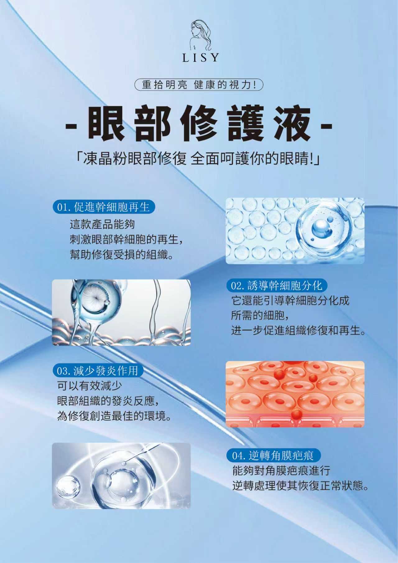 外泌體眼部修護液:台灣大醫院正式發售,為眼疾人士帶來革命性修復體驗 隨著科技進步,眼部護理產品迎來突破性創新!由台灣品牌LISY(國靈)研發的「外泌體眼部修護液」(凍晶粉眼部修復產品),目前已於台灣醫院正式發售,並廣泛應用於臨床治療中,協助無數眼疾人士改善視力問題,重拾明亮健康的雙眼。這款產品結合最新生物技術,以外泌體為核心成分,提供全面且溫和的眼部修護方案。 產品功效:多重作用,全方位修復眼部組織 外泌體眼部修護液具有多項科學驗證的功效,能針對各種眼部問題進行深層修復: · 抑制發炎:有效減輕眼部組織的發炎反應,緩解紅腫、疼痛等不適感。 · 維持淚腺厚度與功能:幫助淚腺保持良好狀態,促進淚液分泌,使眼睛濕潤,並保護眼睛免受外界刺激。 · 恢復角膜透明度:促進角膜修復,提高視覺清晰度,對逆轉角膜疤痕有顯著效果。 · 滋養眼睛感覺神經:舒緩眼部不適感,如刺痛、燒灼感或異物感。 · 促進幹細胞再生與分化:刺激眼部幹細胞再生,引導其分化成所需細胞,加速組織修復與再生。 · 減少發炎作用:為眼部修復創造最佳環境,避免進一步損傷。 這些功效不僅針對常見的眼部不適,更對多種眼疾有輔助治療作用,包括老花眼、近視、散光、結膜炎、青光眼、白內障,甚至黃斑部病變等。 適用人群:廣泛涵蓋各種眼部問題 這款修護液特別適合以下人群使用: · 眼部疼痛、異物感、視力變化或分泌物增加者。 · 出現眼睛刺痛、燒灼感、視力模糊、黑影、飛蚊症、畏光、紅腫、發癢、流淚不止等症狀者。 · 患有視力退化相關問題,如老花、散光、近視,或更嚴重的結膜炎、青光眼、白內障和黃斑部病變。 臨床應用顯示,產品能有效改善患者的生活品質,許多使用者在醫院指導下,已體驗到視力恢復的驚人效果。 使用方法與保存方式:簡單易用,確保功效 為確保產品活性與安全性,使用時請遵循以下步驟: 1. 混合步驟:取3mL人工淚液加入眼部修護製劑(凍晶粉)中,裝上滴管頭,均勻混合。 2. 滴用方法:雙手洗淨後,頭部上仰,用食指拉開下眼瞼,滴管頭朝下輕輕擠壓,將修護液點於結膜囊中。建議每次使用2滴,一日3次。 3. 避免污染:使用後立即蓋上滴管蓋,避免眼睛或其他物品接觸滴管頭。 保存方式: · 未開封的凍晶粉可冷藏保存兩年或室溫一年。 · 開封後務必冷藏,並於7天內使用完畢。 · 避免反覆解凍,以防產品結構受損。 注意事項:安全第一,使用無憂 · 配戴隱形眼鏡時請勿使用。 · 開封後應放置於原盒內,避免與冷藏空間其他物品接觸,以減少污染風險。 · 產品產自台灣,規格為3mL ±5%,品質嚴格把關。 結語:創新科技,點亮清晰未來 外泌體眼部修護液憑藉其獨特的凍乾製程和專利包埋技術,確保外泌體活性不受影響,並結合可溶性蛋白、生長因子等成分,以緩釋劑型形式長時間作用於角膜表面。這款產品已在台灣醫院廣泛應用,為眼疾人士提供安全有效的解決方案。無論是日常保養還是輔助治療,它都能幫助您重拾明亮健康的視力,迎向更清晰的生活! 如果您或家人正面臨眼部問題,不妨諮詢專業醫療人員,了解這款創新產品如何為您帶來改變。